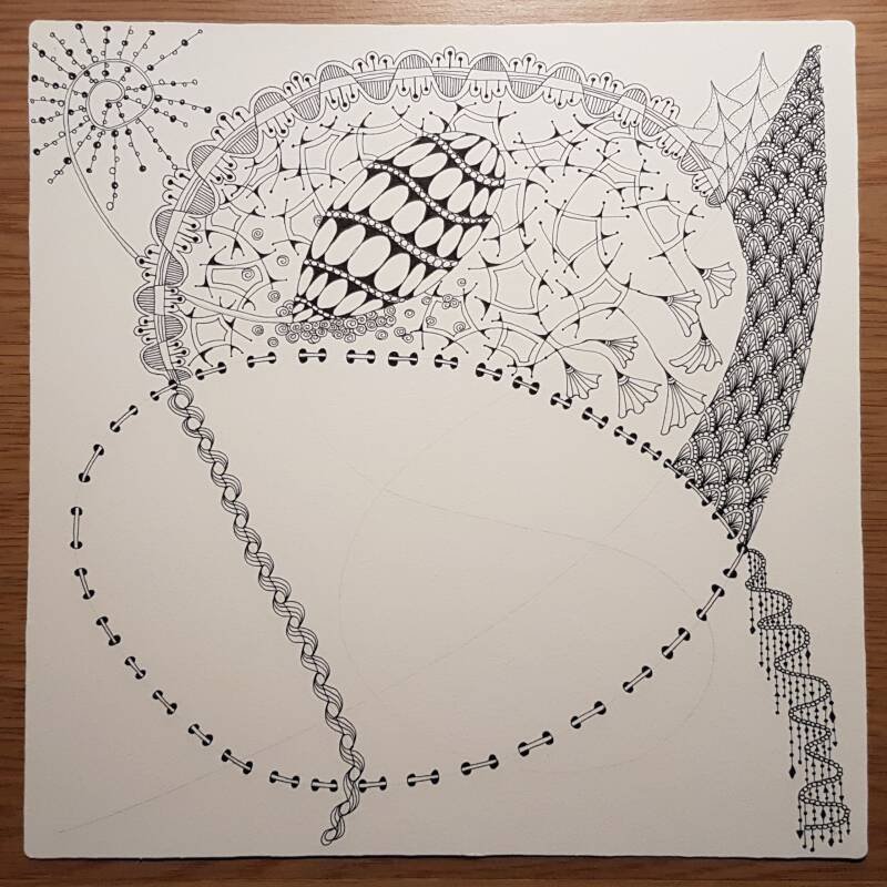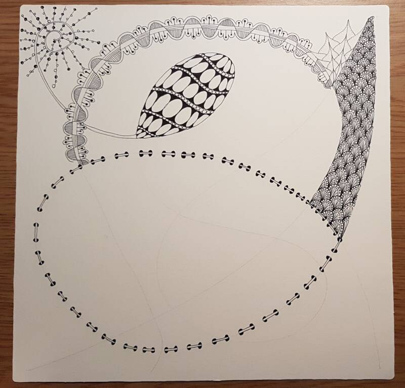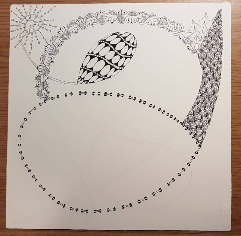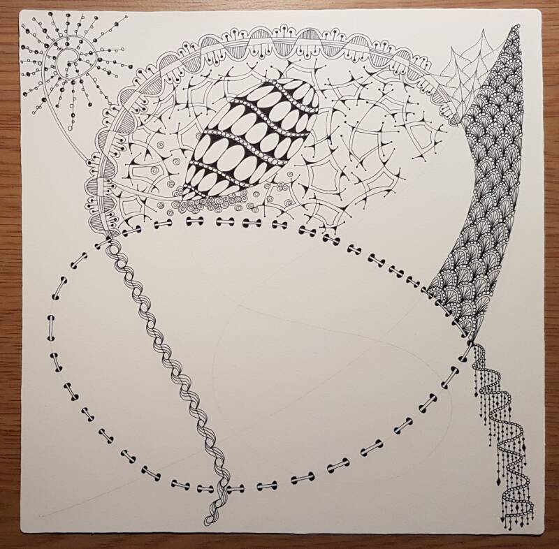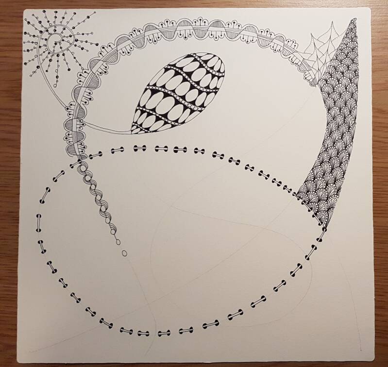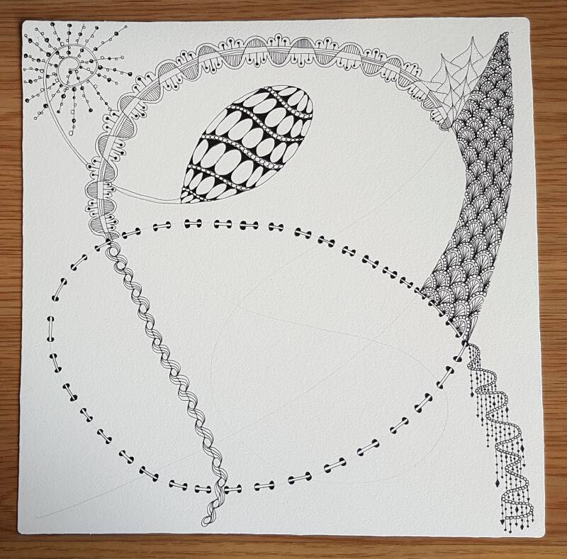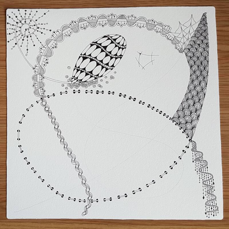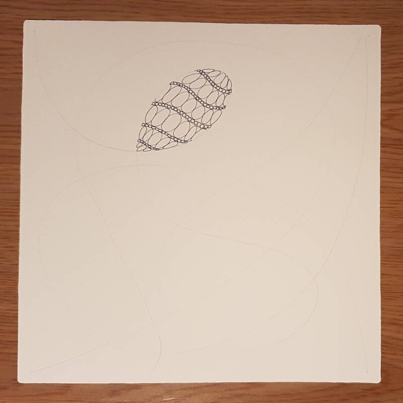Het is niet zo goed te zien, maar hierboven heb ik de strings getekend als basis voor mijn Zentangle.