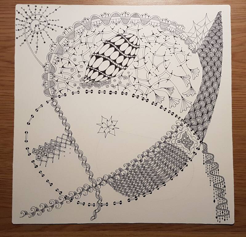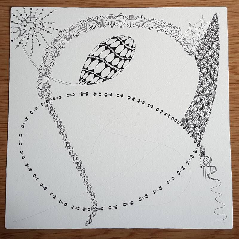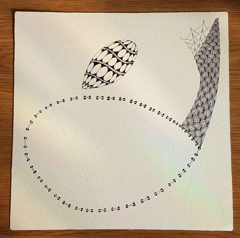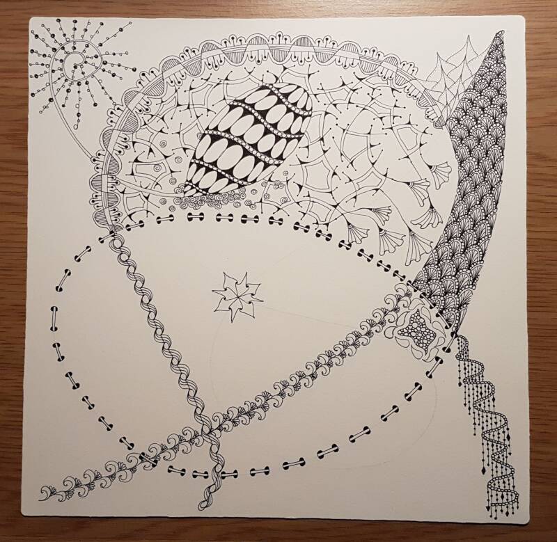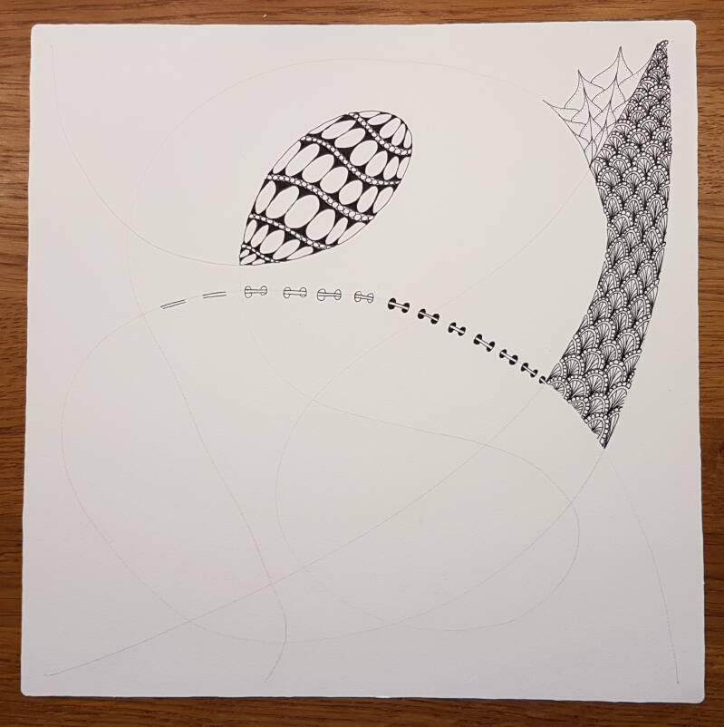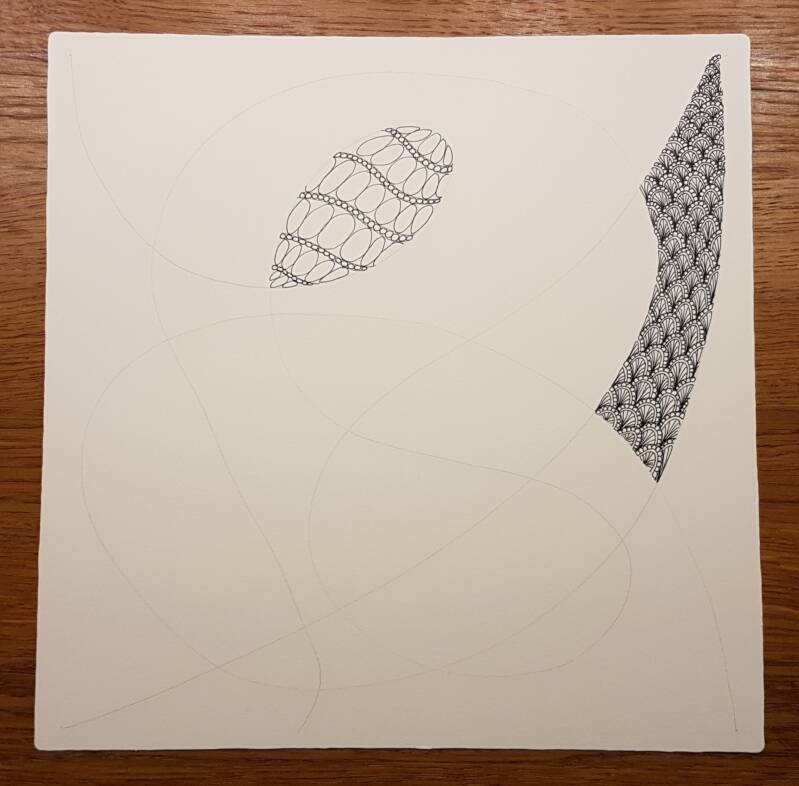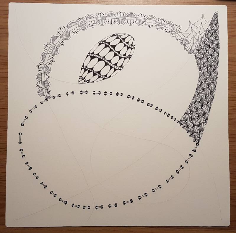 Het is niet zo goed te zien, maar hierboven heb ik de strings getekend als basis voor mijn Zentangle.