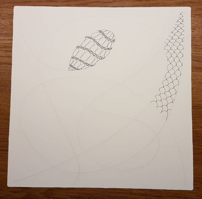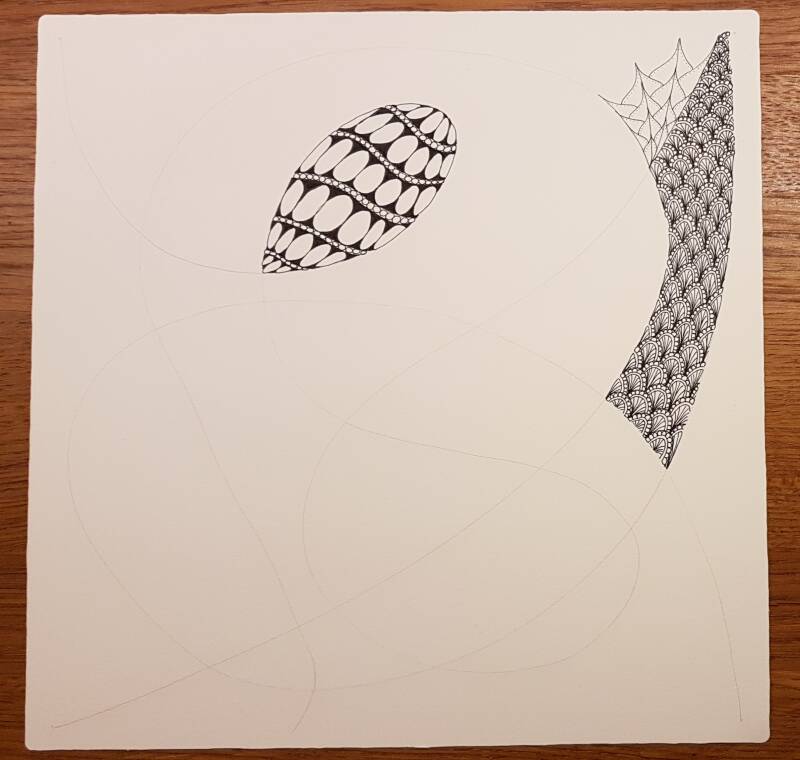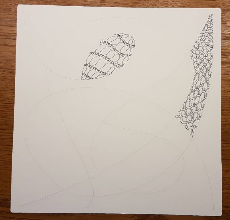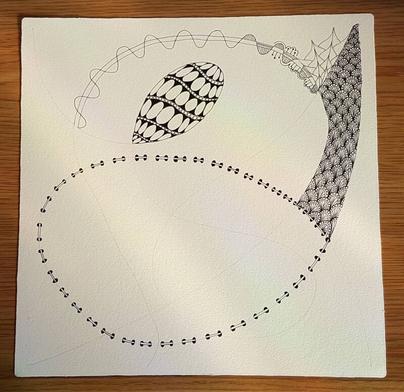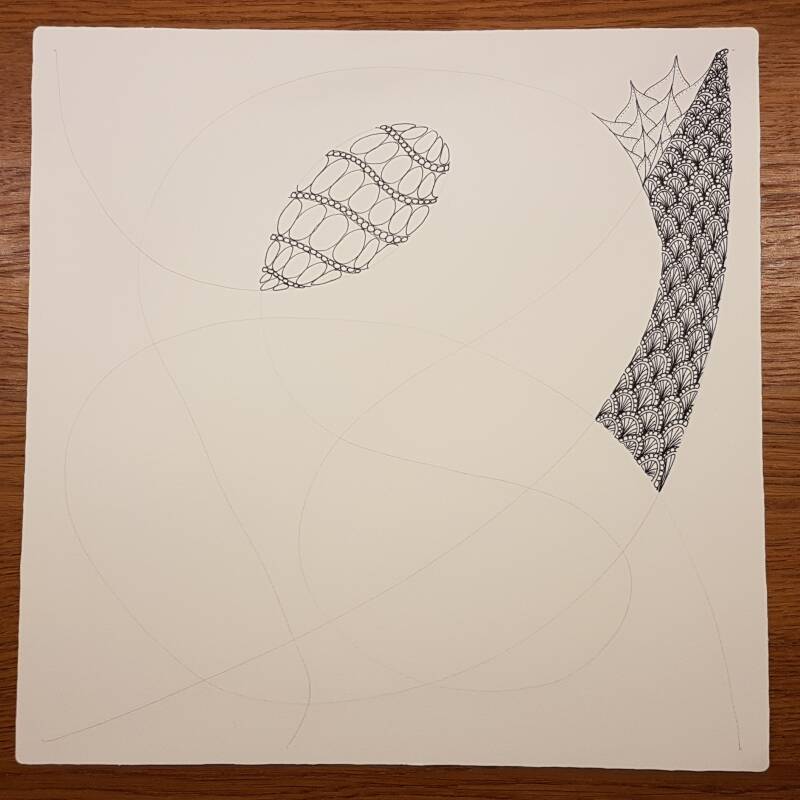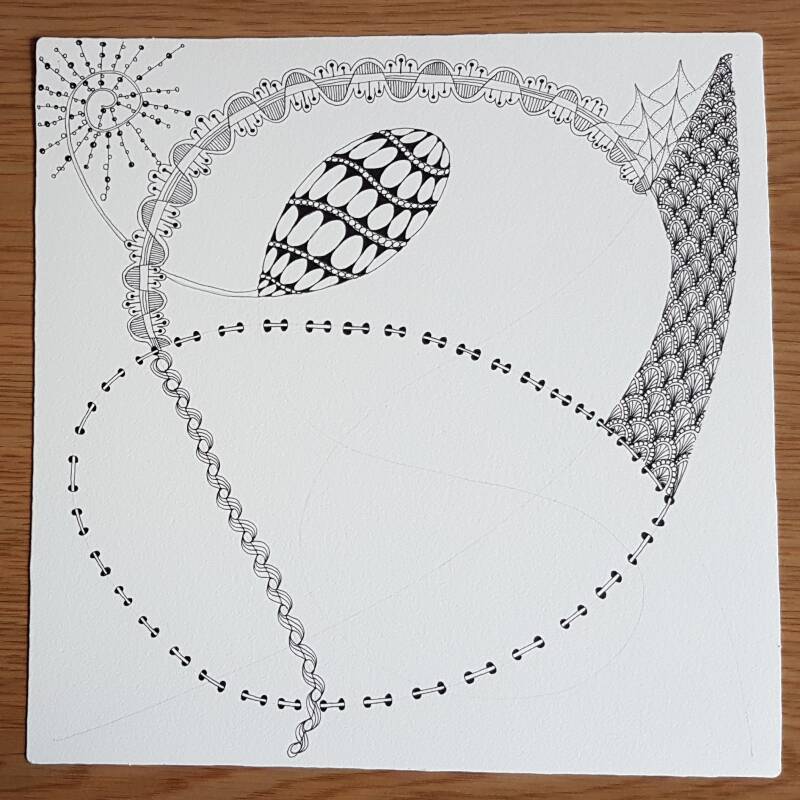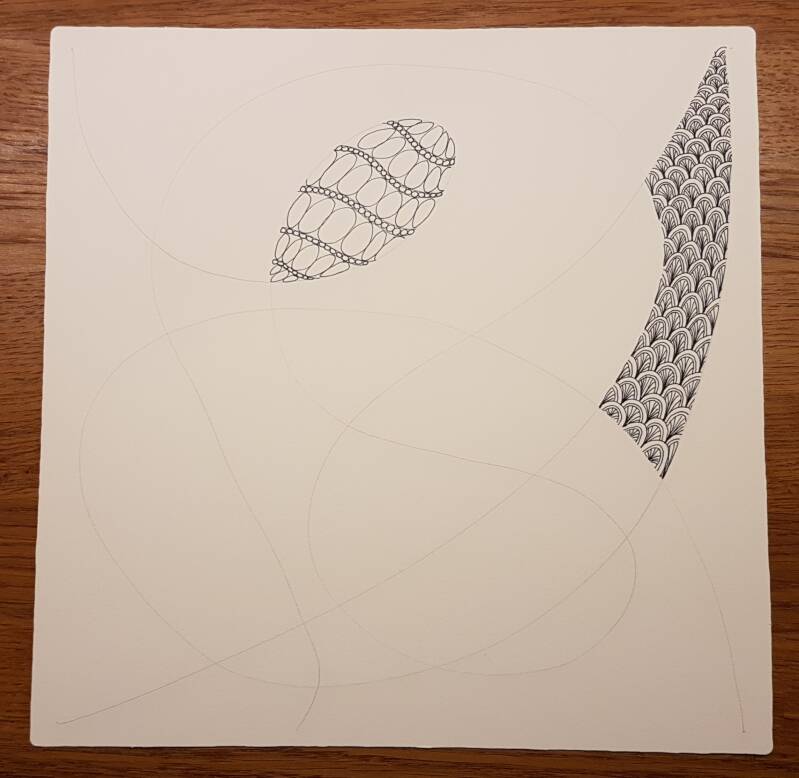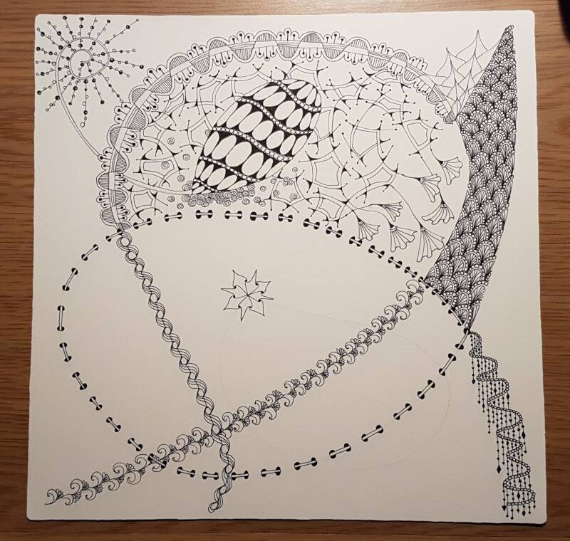 Het is niet zo goed te zien, maar hierboven heb ik de strings getekend als basis voor mijn Zentangle.